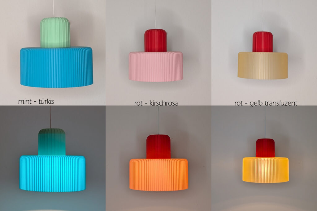 Optisch ein bischen Bauhaus, zart und leicht, mal richtig bunt oder dezent zweifarbig? Aktuell habe ich 17 Farben PLA vorrätig und somit gäbe es theoretisch über 200 Farbkombinationen!